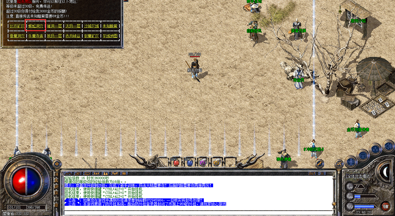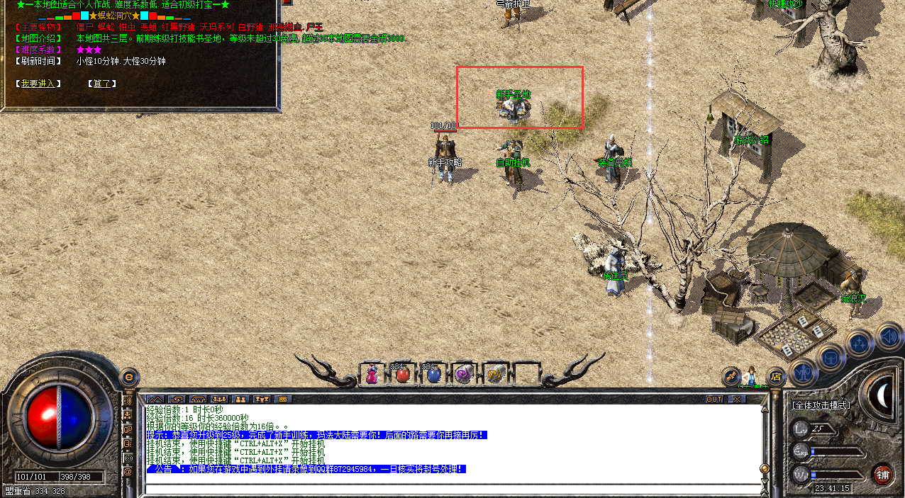 设置完成之后,点击npc,会将玩家传送至新手村,在新手村安全区外,有一个名叫新手练级的NPC,点击进入,能快速升级